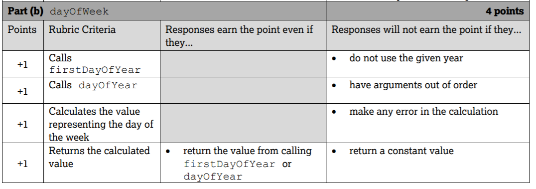 In the 2019 AP exam, part B dayOfWeek method was worth 4 points using the rubric below. Did you receive all 4 points? In class, your teacher may have you grade each othersβ code.