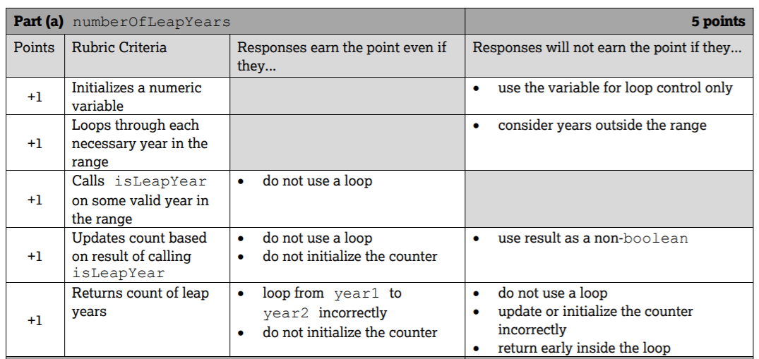 In the 2019 AP exam, part A numberOfLeapYears method was worth 5 points using the rubric below. Did you receive all 5 points? In class, your teacher may have you grade each othersβ code.