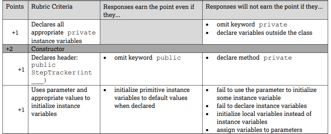 Here is the rubric for the instance variables and the constructor for this problem. Did you receive all 3 points? In class, your teacher may have you grade each othersβ code.