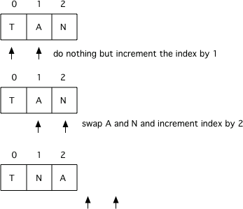 In this example we are looping through the characters from left to right one at a time and comparing the two adjacent characters. If the first is an βAβ and the second is not we will swap the characters and then need to increment the index to not check the ones we swapped again. So we start checking the characters at index 0 and 1 and then swap them, but then move to comparing 2 and 3 rather than 1 and 2 which means we increment the current index by 2. If we donβt swap the characters we only increment the index by 1.