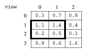 nightSky is a SkyView object where view contains the values shown below, the call nightSky.getAverage(1, 2, 0, 1) should return 0.8. (The average is (1.1 + 1.4 + 0.2 + 0.5) / 4, which equals 0.8). The section being averaged is indicated by the dark outline in the table below.