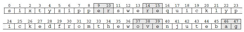 "sixtyzipperswerequicklypickedfromthewovenjutebag". This string and its indexes are shown below.