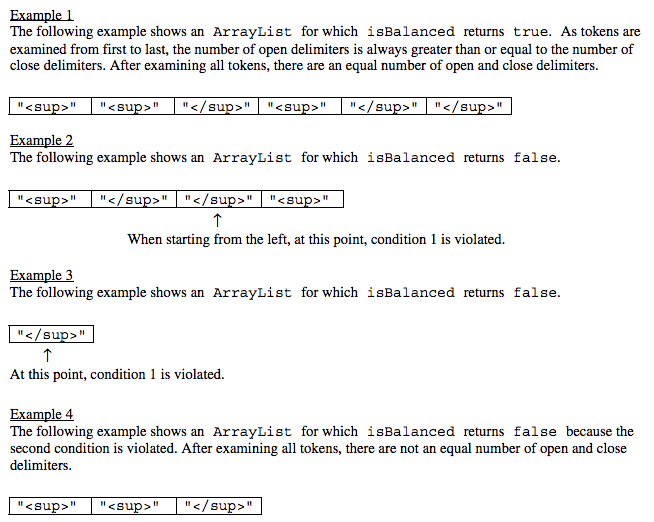 Delimiters object for which openDel` is "<sup>" and closeDel is "</sup>". The examples below show different ArrayList objects that could be returned by calls to getDelimitersList and the value that would be returned by a call to isBalanced.