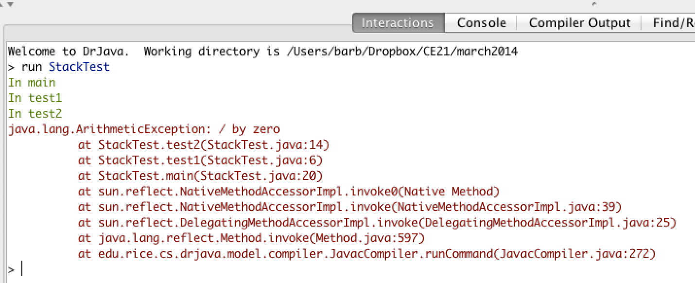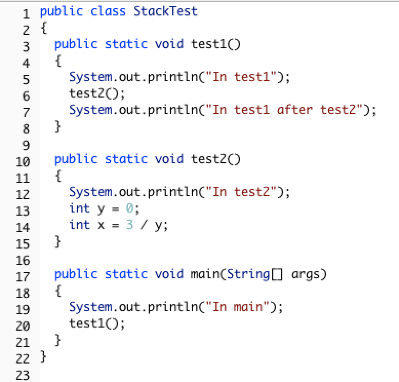 main method calls the method test1 (at line 20) which calls the method test2 (at line 6) which has the divide by zero error (line 14). This can be seen in the call stack shown below which shows the call stack from the top (most recent method) to the bottom (first method call).