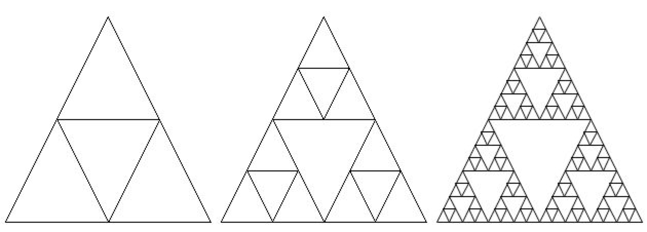 Recursion can also be used to create fractals. A simple example is Sierpinskiβs triangle in which you subdivide a triangle into 4 new triangles as shown below. You can then do the some procedure with each new triangle except the center one.