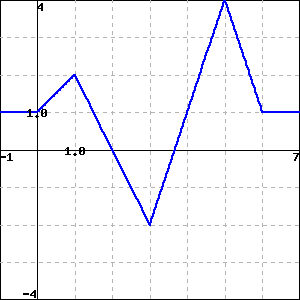 Suppose that the following information is known about a function \(f\text{:}\) the graph of its derivative, \(y = f'(x)\text{,}\) is given in the figure below. Further, assume that \(f'\) is piecewise linear (as pictured) and that for \(x \le 0\) and \(x \ge 6\text{,}\) \(f'(x) = 0\text{.}\) Finally, it is given that \(f(0) = 1\text{.}\)