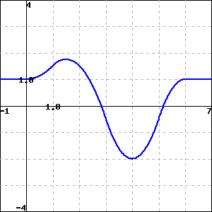 At right, three different antiderivatives of \(f\) are shown; these curves are “parallel” to each other, with the only difference between any two of them being a vertical shift. The middle of the three graphs is \(F(x)\text{,}\) which satisfies \(F(0) = 1\text{.}\) Some other exact values of \(F(x)\) are discussed in the paragraph of text that follows this image. The function \(F\) is constant for \(x \lt 0\) and \(x \gt 6\) (with value \(F(x) = 1\) on those intervals). \(F(x)\) is increasing and concave up on \(0 \lt x \lt 1\) and \(4 \lt x \lt 5\text{;}\) \(F(x)\) is increasing and concave down on \(1 \lt x \lt \frac32\) and \(5 \lt x \lt 6\text{.}\) \(F(x)\) is decreasing and concave down on \(\frac32 \lt x \lt 3\text{;}\) \(F(x)\) is decreasing and concave up on \(3 \lt x \lt 4\text{.}\) The graph of \(G(x)\) is \(F(x) + 2\text{,}\) while the graph of \(H(x)\) is \(F(x) - 2\text{.}\)