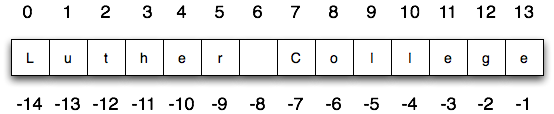 It is also the case that the positions are named from right to left using negative numbers where -1 is the rightmost index and so on. Note that the character at index 6 (or -8) is the blank character.