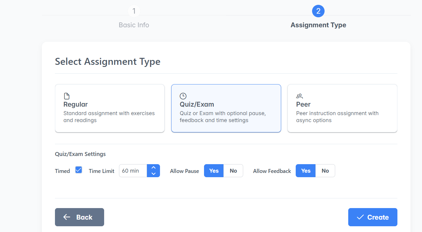 In the new Assignment Builder in the Instructor Dashboard, you can choose to make a new assignment a Quiz/Exam like below where you can select whether there is a time limit and whether pauses and feedback are allowed.