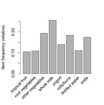 This command yields about 25 items on the X-axis. Without worrying too much about the labels, you can also experiment with lower values of support, just to get a feel for how many items appear at the lower frequencies. We need to guess at a minimum level of support that will give us quite a substantial number of items that can potentially be part of a rule. Nonetheless, it should also be obvious that an item that occurs only very rarely in the grocery baskets is unlikely to be of much use to us in terms of creating meaningful rules. Letβs pretend, for example, that the item "Venezuelan Beaver Cheese" only occurred once in the whole set of 9835 carts. Even if we did end up with a rule about this item, it wonβt apply very often, and is therefore unlikely to be useful to store managers or others. So we want to focus our attention on items that occur with some meaningful frequency in the dataset. Whether this is one percent or half a percent, or something somewhat larger or smaller will depend on the size of the data set and the intended application of the rules.