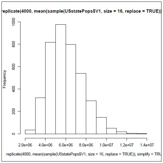There’s the nested function call again. The output no longer shows the 16 values that R has sampled from the list of 51. Instead it used those 16 values to calculate the mean and display that for us. If you have a good memory, or merely took the time to look in the last chapter, you will remember that the actual mean of our 51 observations is 6,053,834. So the mean that we got from this one sample of 16 states is really not even close to the true mean value of our 51 observations. Are we worried? Definitely not! We know that when we draw a sample, whether it is gumballs or states, we will never hit the true population mean right on the head. We’re interested not in any one sample, but in what happens over the long haul. So now we’ve got to get R to repeat this process for us, not once, not four times, but four hundred times or four thousand times. Like most programming languages, R has a variety of ways of repeating an activity. One of the easiest ones to use is the replicate() function. To start, let’s just try four replications: