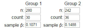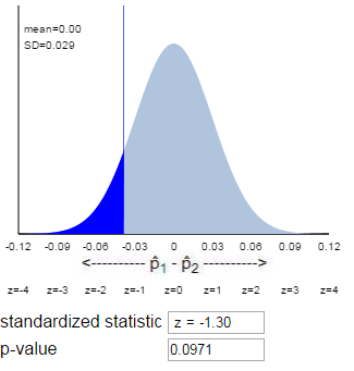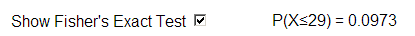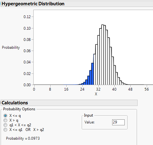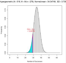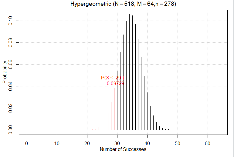 exact p-value = \(P(X \lt 29)\) with \(M = 64\text{,}\) \(n = 278\text{,}\) \(N = 518\)) = 0.0973