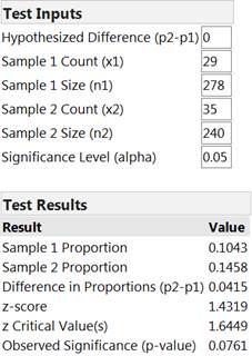 Because the sample sizes are large in this study, you should not be surprised that the probability distribution in checkpoint 6 is approximately normal. The large sample sizes allow us to approximate the hypergeometric distribution with a normal distribution. Thus, with large samples sizes (e.g., at least 5 successes and at least 5 failures in each group), an alternative to Fisherβs Exact Test is the two-sample z-test that you studied in Section 3.1.