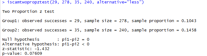 Note: Even with a 90% confidence level, zero is captured in the interval, even though we rejected the null hypothesis for a 10% level of significance. This can happen when you compare a one-sided p-value to a confidence interval which corresponds to a two-sided p-value. The other issue is even 0.0896 is not all that large of a value, so even if you consider the difference statistically significant, itβs not clear whether the CC treatment has a "large" benefit.