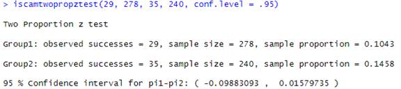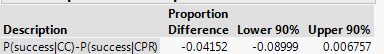 95% CI for \(\pi_{CPR} - \pi_{CC}\text{:}\) (-0.0988, 0.0158)