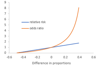 The graphs below show how (a) the probability of success and odds of success are related and (b) how relative risk and odds ratios are similar when the difference in proportions is small. Also note that when the difference in proportions is zero, the relative risk and the odds ratio are both one.
