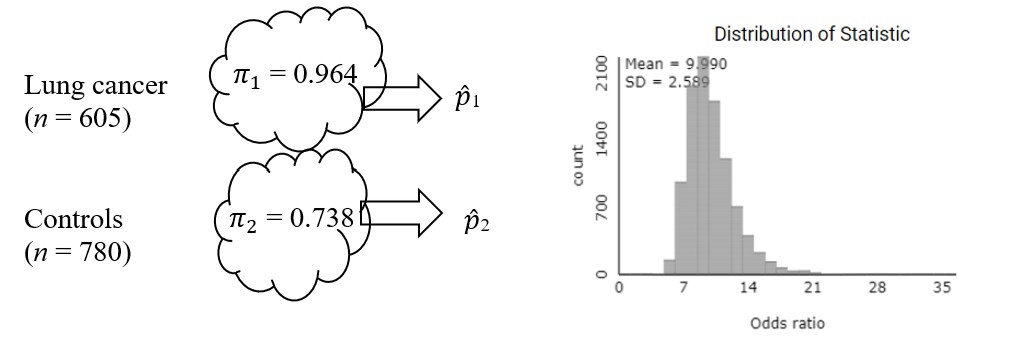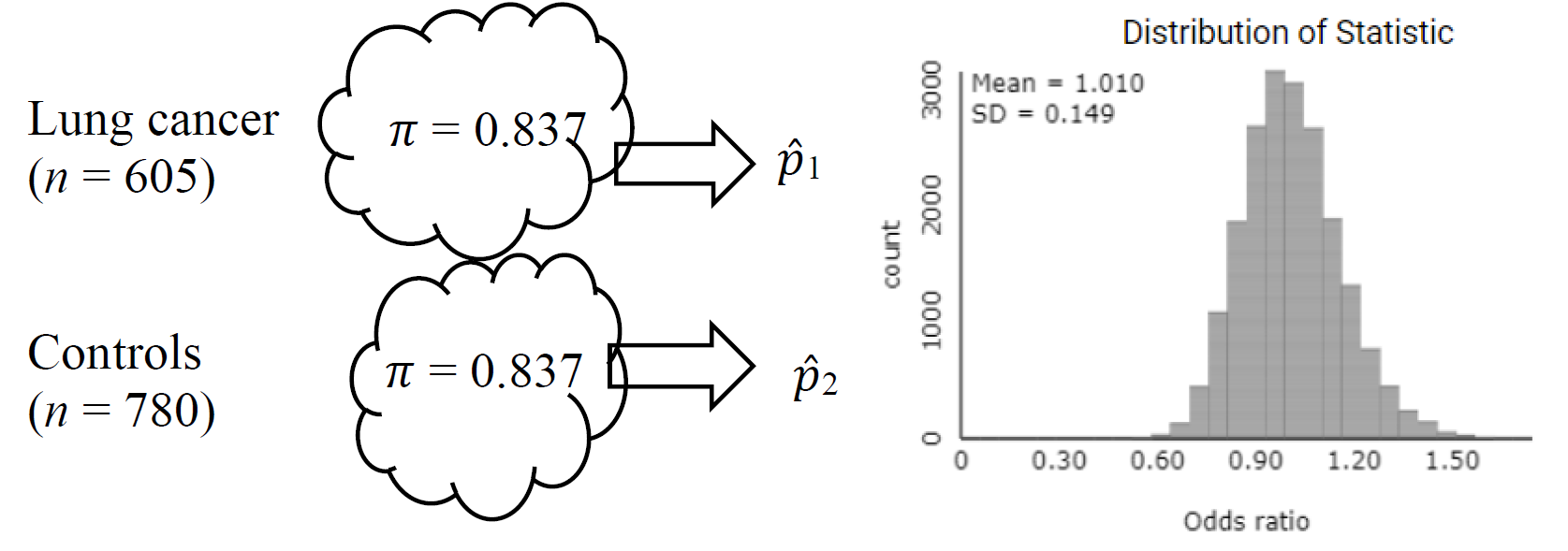 To simulate outcomes for a case-control study, we can treat the numbers of cases (lung cancer patients) and control patients as fixed, and randomly sample from each population, determining the proportion that are in group B (e.g., heavy smokers). Under the null hypothesis, we could use 1159/1385 β 0.837 as the common probability of success in the Comparing Two Population Proportions applet and generate a sampling distribution of odds ratios.