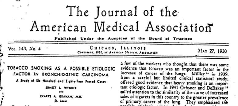After World War II, evidence began mounting that there was a link between cigarette smoking and pulmonary carcinoma (lung cancer). In the 1950s, three now classic articles were published on the topic. One of these studies was conducted in the United States by Wynder and Graham ("Tobacco Smoking as a Possible Etiologic Factor in Bronchiogenic Cancer," 1950, Journal of the American Medical Association). They found records from a large number of patients with a specific type of lung cancer in hospitals in California, Colorado, Missouri, New Jersey, New York, Ohio, Pennsylvania, and Utah. Of those in the study, the researchers focused on 605 male patients with this form of lung cancer. Another 780 male hospital patients with similar age and economic distributions without this type of lung cancer were interviewed in St. Louis MO, Boston MA, Cleveland OH, and Hines IL. Subjects (or family members) were interviewed to assess their smoking habits, occupation, education, etc. The table below classifies them as a non-smoker or light smoker or as an at least a moderate smoker.