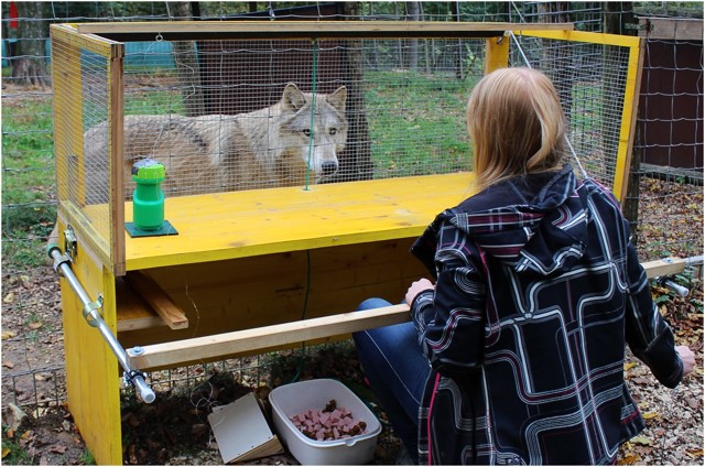 Lampe et al. (2017) gave captive wolves, pack dogs living in identical conditions to the wolves, and pet dogs living with families a series of "object-choice tasks." A table was placed outside a fenced compartment, and a container was placed at each end of the table, one containing food and one empty. The experimenter would give the cue as to which container had the food and then the animal would touch one of the two targets next to the containers. A 6-year-old female timber wolf, Yukon, chose the intended container in 6 of the 8 trials with behavioral cues.