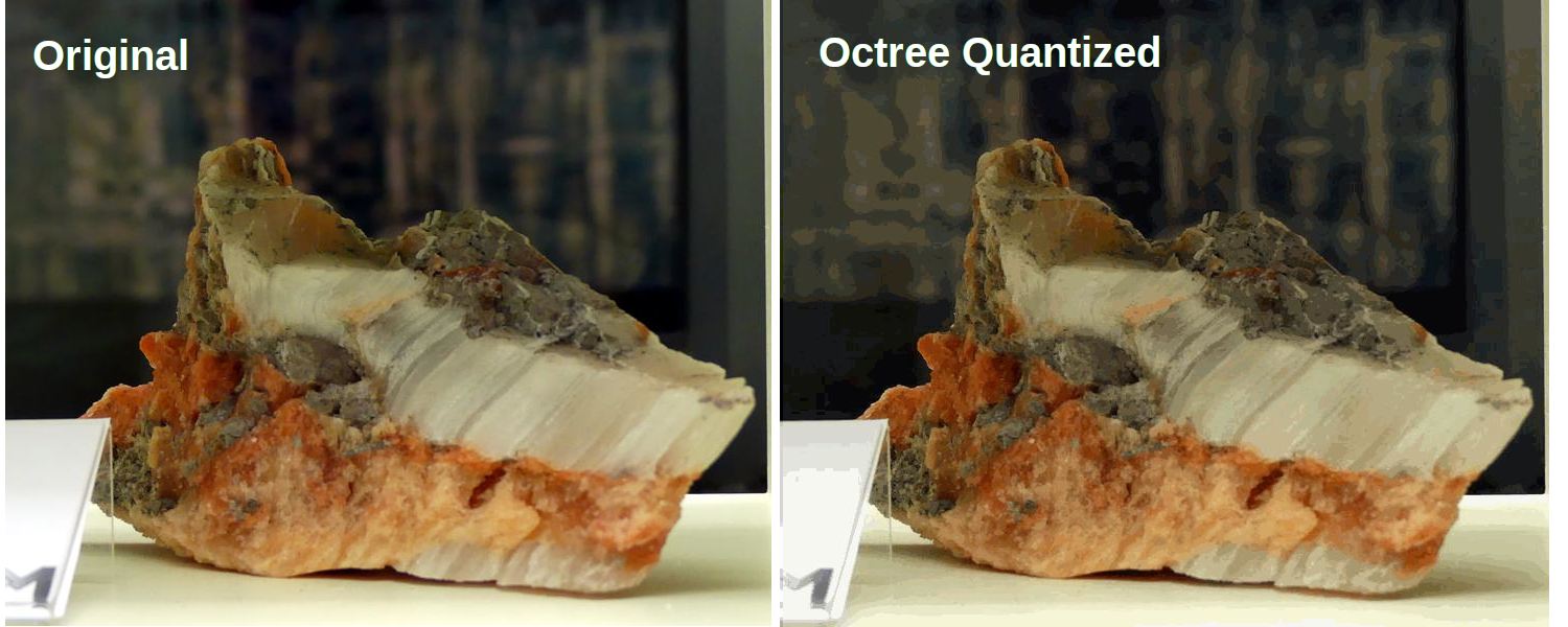 Figureย 11.4.5 shows a before and after comparison of original and quantized images of a crystal. You can use any JPEG color image from your collection and run the program to see the differences. Notice how much detail is lost in the quantized picture.