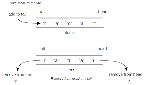 The solution to this problem will use a deque to store the characters of the string. We will process the string from left to right and add each character to the tail of the deque. At this point, the deque will be acting very much like an ordinary queue. However, we can now make use of the dual functionality of the deque. The head of the deque will hold the first character of the string and the tail of the deque will hold the last character (see Figure 3.18.1).