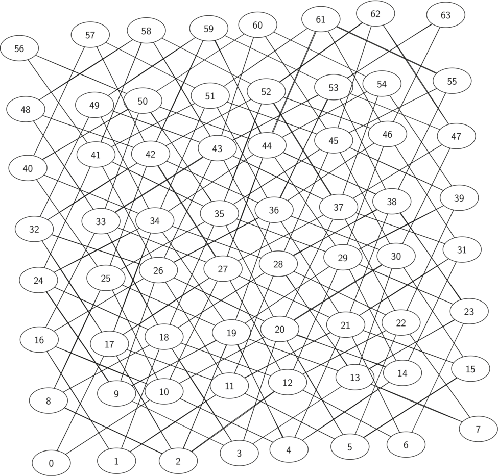 Figure 10.12.4 shows the complete graph of possible moves on an \(8 \times 8\) board. There are exactly 336 edges in the graph. Notice that the vertices corresponding to the edges of the board have fewer connections (legal moves) than the vertices in the middle of the board. Once again we can see how sparse the graph is. If the graph was fully connected there would be 4,096 edges. Since there are only 336 edges, the adjacency matrix would be only 8.2 percent full.