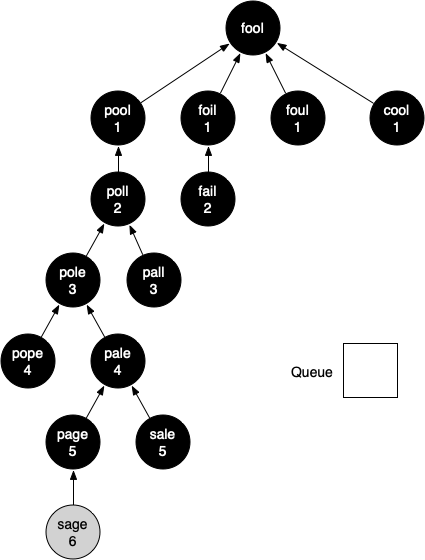 bfs method would construct the breadth-first tree corresponding to the graph in Section 10.8. Starting from FOOL we visit all nodes that are adjacent to FOOL, and add them to the tree. The adjacent nodes include POOL, FOIL, FOUL, and COOL. For each of these nodes, we record their previous vertex (shown via arrows), and their distance (shown as 1). These nodes are then added to the queue of new nodes to expand. Figure 10.9.2 shows the state of the in-progress tree along with the queue after this step. In the figure, the start node is shown as black because we have now discovered all of its neighbors, whereas all of the new nodes are gray because we have not finished exploring each of them.