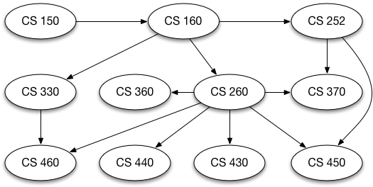 As a student of computer science you may wonder about the courses you must take for your major. A graph is good way to represent the prerequisites and other interdependencies among courses. Figure 10.1.1 shows such a graph. It represents the courses and the order in which they must be taken to complete a major in computer science at Luther College.