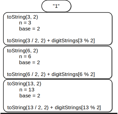 toString(2 / 2, 2) defined in Listing 4.4 leaves a return value of "1" on the stack. This return value is then used in place of the function call (toString(1, 2)) in the expression "1" + digitStrings[3 % 2], which will leave the string "11" on the top of the stack. In this way, the Kotlin call stack takes the place of the stack we used explicitly in Listing 4.6.1. In our list-summing example, you can think of the return value on the stack taking the place of an accumulator variable.