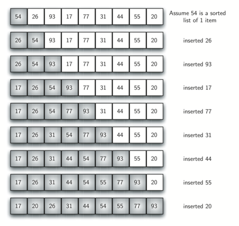 The insertion sort, although still \(O(n^{2})\text{,}\) works in a slightly different way. It always maintains a sorted sublist in the lower positions of the list. Each new item is then inserted back into the previous sublist such that the sorted sublist is one item larger. Figure 5.8.1 shows the insertion sorting process. The shaded items represent the ordered sublists as the algorithm makes each pass.