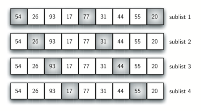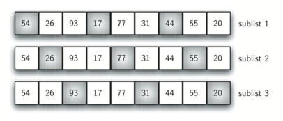 The Shell sort, sometimes called the diminishing increment sort, improves on the insertion sort by breaking the original list into a number of smaller sublists, each of which is sorted using an insertion sort. The unique way that these sublists are chosen is the key to the Shell sort. Instead of breaking the list into sublists of contiguous items, the Shell sort uses an increment \(i\text{,}\) sometimes called the gap, to create a sublist by choosing all items that are \(i\) items apart.