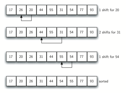 Figure 5.9.3 shows a final insertion sort using an increment of one—in other words, a standard insertion sort. Note that by performing the earlier sublist sorts, we have now reduced the total number of shifting operations necessary to put the list in its final order. For this case, we need only four more shifts to complete the process.