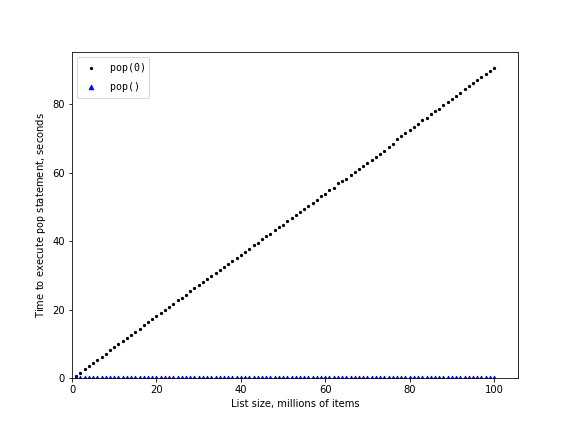 pop. As you can see from this first example, popping from the end takes 0.00014 milliseconds, whereas popping from the beginning takes 2.09779 milliseconds. For a list of two million elements this is a factor of 15,000.