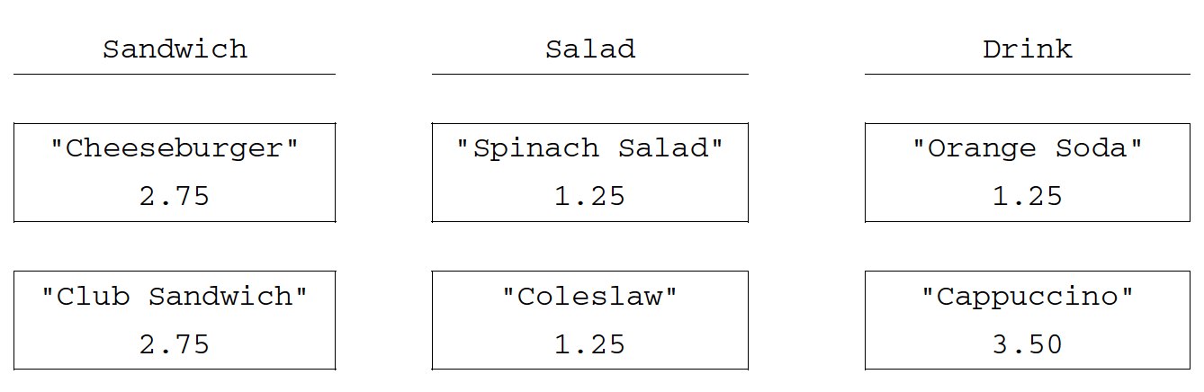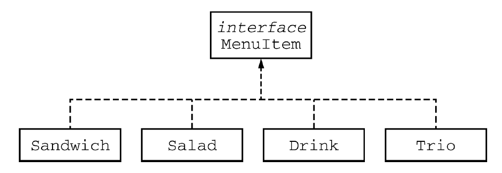 The menu at a lunch counter includes a variety of sandwiches, salads, and drinks. The menu also allows a customer to create a “trio,” which consists of three menu items: a sandwich, a salad, and a drink. The price of the trio is the sum of the two highest-priced menu items in the trio; one item with the lowest price is free. Each menu item has a name and a price. The four types of menu items are represented by the four classes Sandwich, Salad, Drink, and Trio. All four classes implement the following MenuItem interface.