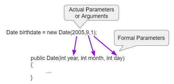 When a constructor like Date(2005,9,1) is called, the formal parameters, (year, month, day), are set to copies of the actual parameters (or arguments), which are (2005,9,1). This is call by value which means that copies of the actual parameter values are passed to the constructor. These values are used to initialize the object’s attributes.