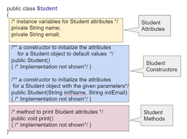 Student class with a method signature public void print() which has an empty parameter list with no parameters. Methods are defined after the instance variables (attributes) and constructors in a class.