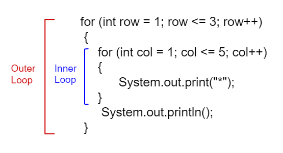 A nested loop has one loop inside of another. These are typically used for working with two dimensions such as printing stars in rows and columns as shown below. When a loop is nested inside another loop, the inner loop runs many times inside the outer loop. In each iteration of the outer loop, the inner loop will be re-started. The inner loop must finish all of its iterations before the outer loop can continue to its next iteration.