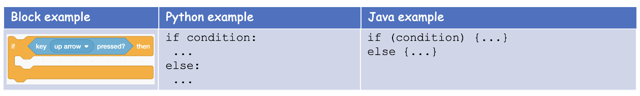 If statements are found in all programming languages as a way to make choices. Here’s a comparison of ifs in App Inventor blocks, CSP block and pseudocode and Java ifs.